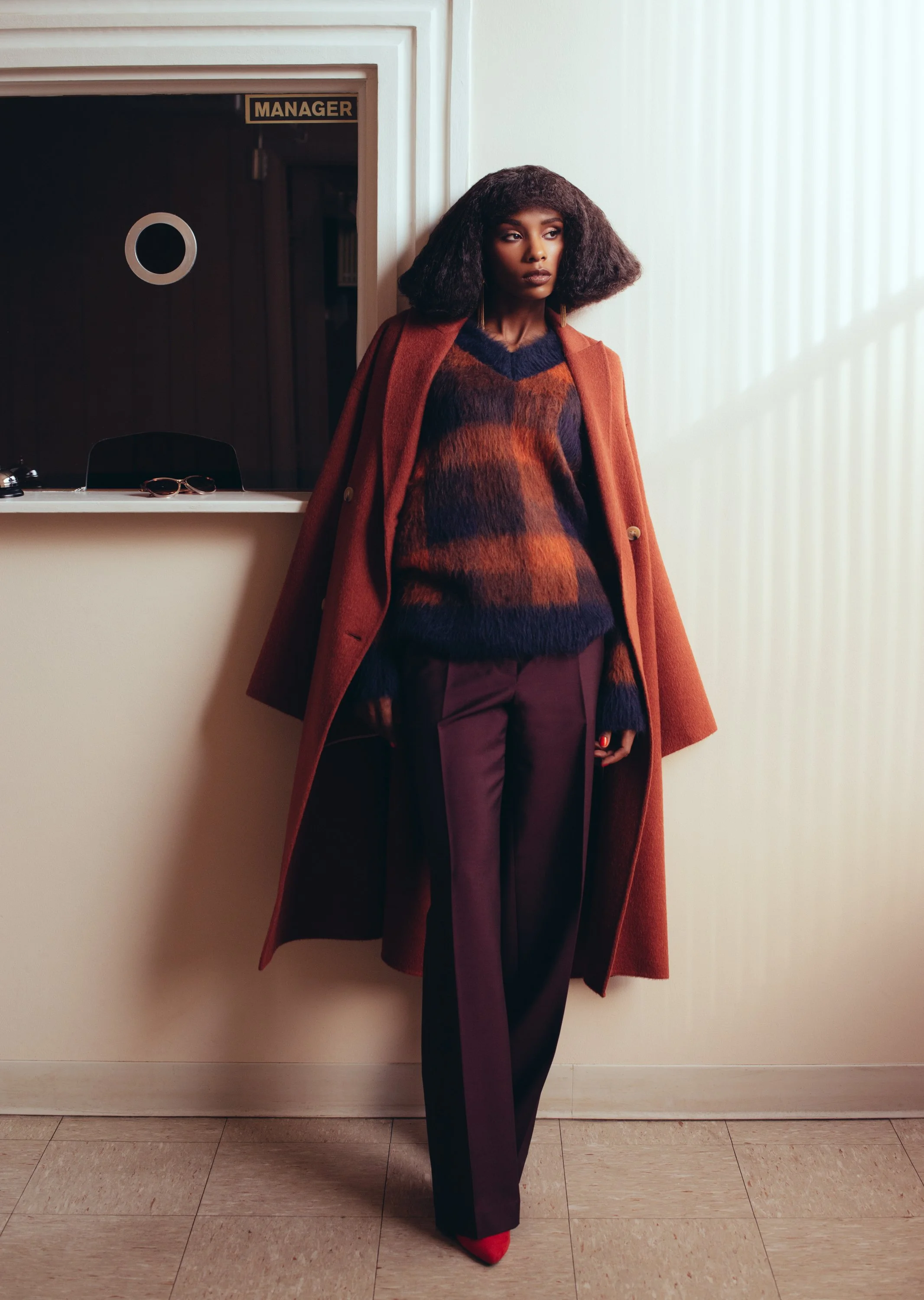 A chic heroine radiates with life against the backdrop of a 1950s office building in middle America. As we follow her mysterious envelope escaping the mundane office interior, we are drawn to her carefree vibes. Dancing through the drab halls in her colorful orange coat, living her best life, she embodies the freedom of possibility. A stark contrast to the office personnel stuck in the daily grind of corporate America. They are both separated by and connected through the window.